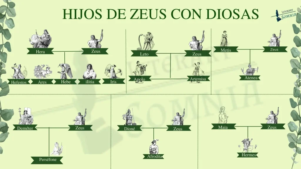 La unión de Zeus con otras deidades dio origen a una estirpe de dioses y diosas poderosos que heredaron parte de su fuerza y majestuosidad. Entre los hijos divinos de Zeus más destacados se encuentran:
